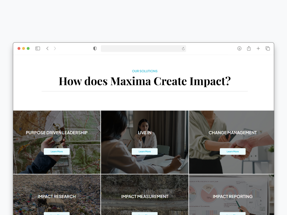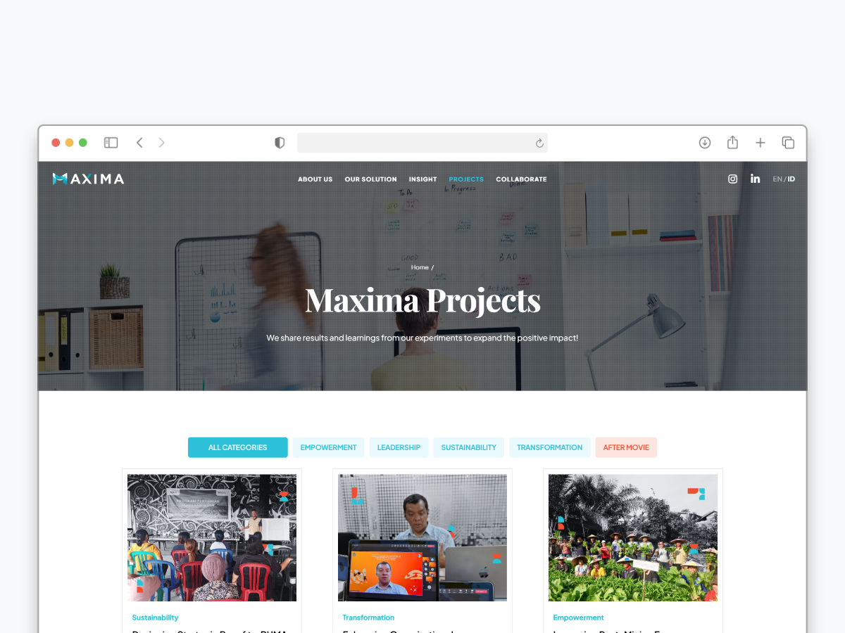 Maxima is an impact agency based in Indonesia specializing in organizational transformation and sustainability programs They needed a website that could clearly communicate their vision mission and the impact they create across sectors We developed a clean and responsive website designed to highlight their services values and case studies The layout prioritizes clarity and accessibility while ensuring that their message is delivered effectively across devices The result is a modern digital presence that strengthens Maxima’s positioning as a strategic partner for sustainable change
